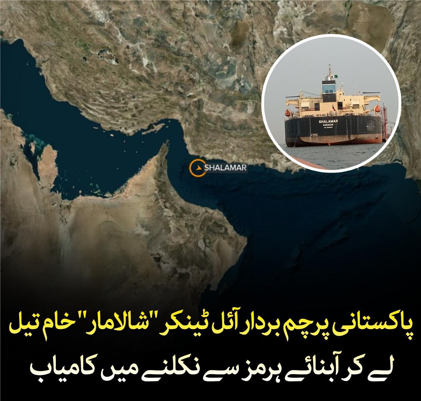 پاکستانی پرچم بردار آئل ٹینکر “شالامار” متحدہ عرب امارات سے لوڈ کیا گیا خام تیل لے کر آبنائے ہرمز کے ذریعے خلیج سے باہر نکل گیا ہے۔
